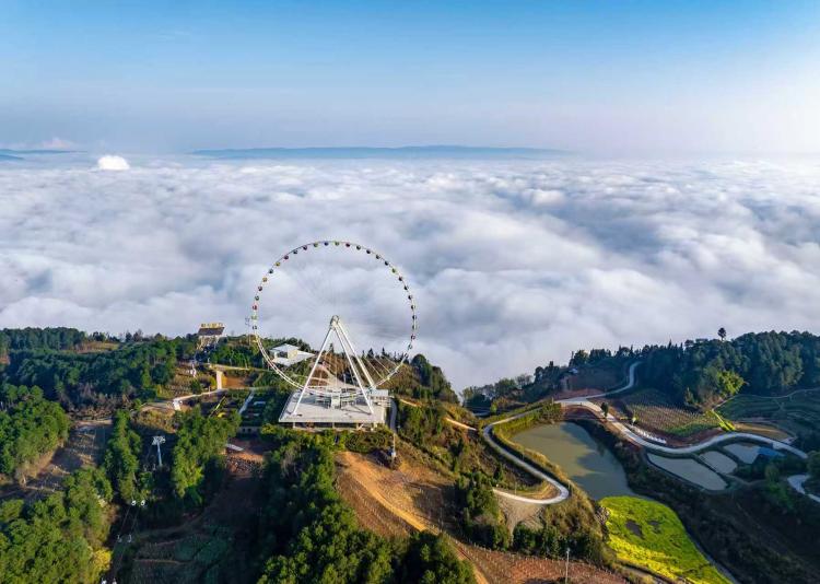 在交通方面,景区依托山地地形建成了由7条索道组成的索道环线,串联周边酿酒葡萄产业园。游客可乘坐索道至山顶区域,体验海拔较高的摩天轮项目,该景观在云海天气条件下呈现一定视觉效果。