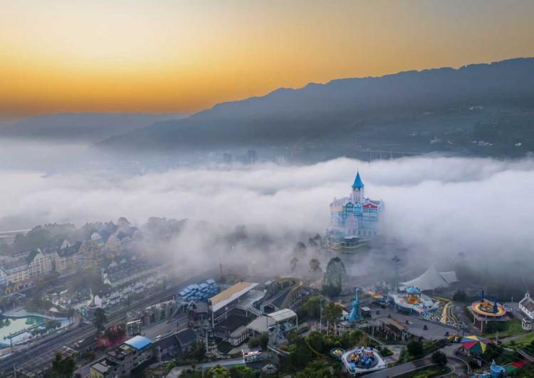 美心红酒小镇地处长江沿岸,因地形与水系交汇,具备云海形成的自然条件。暖湿空气流经较冷下垫面时易凝结成云,形成翻涌的云层。清晨时段,在小镇设置的观景平台上可远眺长江与梨香溪交汇处,云层在河谷地带聚集,环绕欧式风格建筑群,形成具有一定视觉冲击力的景观。日出时分,阳光映照江面,与云雾交织,呈现出较为典型的长江沿线气象景观。